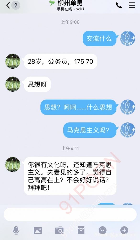 一个单男来和夫妻交流什么思想呢?夫妻还得给单男写个总结报告吗?无非就是来口嗨吧?他会问你老婆多高,你老婆多重,你老婆骚不骚,你老婆叫床声音大不大,你老婆喜欢JJ长的还是粗的,能不能把你老婆露脸生活照发给我,能不能让我先和你老婆通个话...... 无穷无尽的各种奇葩要求都会提出来,相信找过单男的夫妻我说的这些都有体会,只要你不配合,那么之前说那些都白说了,他立刻会翻脸!想做单男就好好介绍自己的情况,合适了再谈下一步,不合适就当是朋友了,何必把自己没教养的本性暴露出来,因为我问了一句 马克思主义?立刻夹枪带棒的开始说一些阴阳怪气的话,其实细节从这里就能看出来,只要夫妻不肯配合他意淫,立刻就翻脸,就这样的单男谁敢和他活动,我得庆幸他暴露的及时,而且说完拜拜,根本没走,还偷偷进我空间,我不明白他这种行为是什么目的,才有了我后来请他滚!结果大家看下图,一口气骂了我三句,句句恶毒,我都怀疑这是从一个男人嘴里骂出来的话