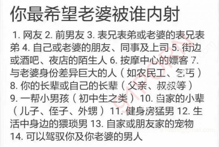 [img] [/img]发现个调查挺有趣的,狼友们可以评论一下最希望老婆被谁内射?