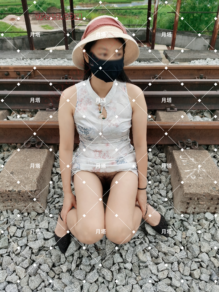桥下有行人路过,老婆只能坐在铁路上悄悄的把“黑森林”露出来。