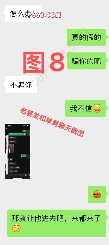 那天,单男发来信息给我说想过来问我方不方便,我告诉他没问题,叫他直接到小区里。碰面后,我交代了一些和老婆聊天和日常的内容以避免穿帮,让他登录上我的微信小号。然后让他直接上楼发消息告诉老婆过来看她了并且已经到门口了。因为我深知老婆的性格,虽然嘴上一直不同意,但是经过这半个月的热聊,最重要的是单男在这段时间在她身上花费了大量的金钱(不低于3000),让老婆有了一种吃人嘴软拿人手短的思想包袱,所以我断定,让单男直接上门老婆不会拒绝!单男到了小区给老婆发消息后,老婆马上发消息给我说那个人果然去找她了,问我怎么办?(见图7、8、9)