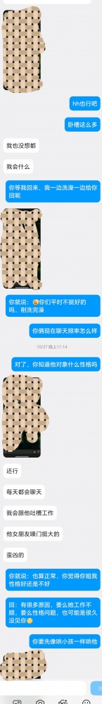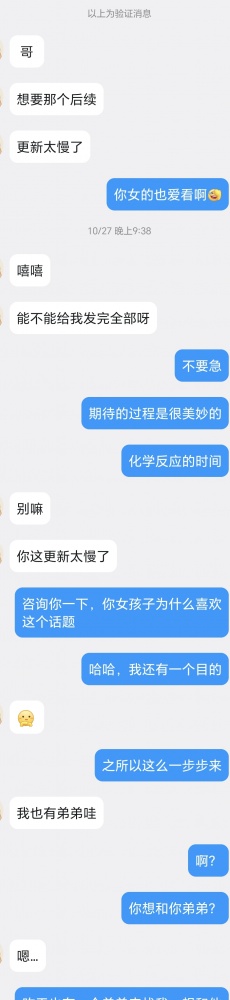 姐姐假装洗澡回来后,等来的是弟弟一堆的信息,主要还是恋爱,这个可以不看,就是吐槽恋爱怎么怎么不顺。有过经验的同志可以看得出来,这是话题切入,从恋爱开始