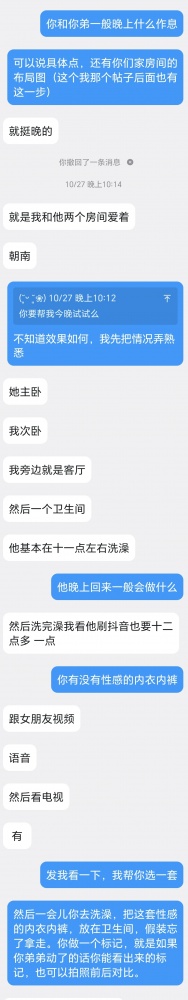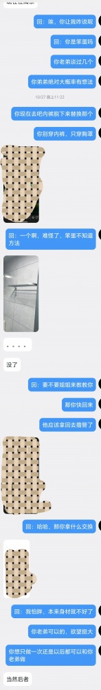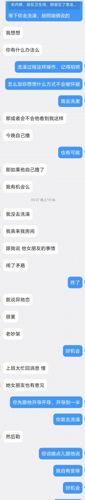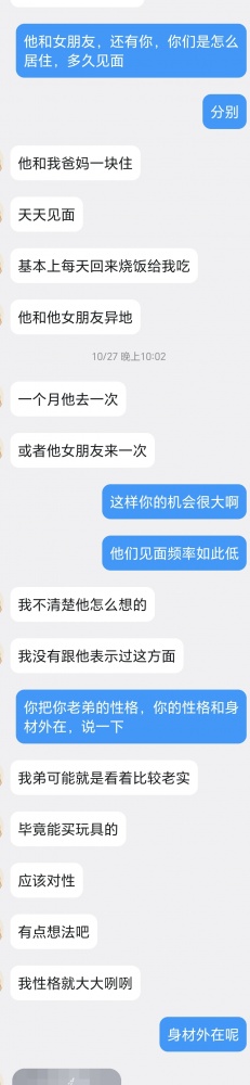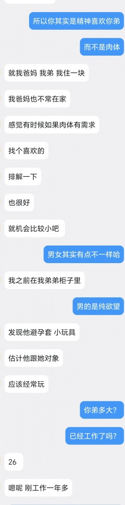 给没看过的观众还是简略说一下,上一个帖子发了之后,有一个小姐姐私信。她和弟弟一起生活在一个城市,住套房。弟弟有对象,异地,姐姐则空窗很久。弟弟也是姐姐喜欢的男生类型,自从看了我的帖子,第二天就有这个想法。于是就有了如下对话